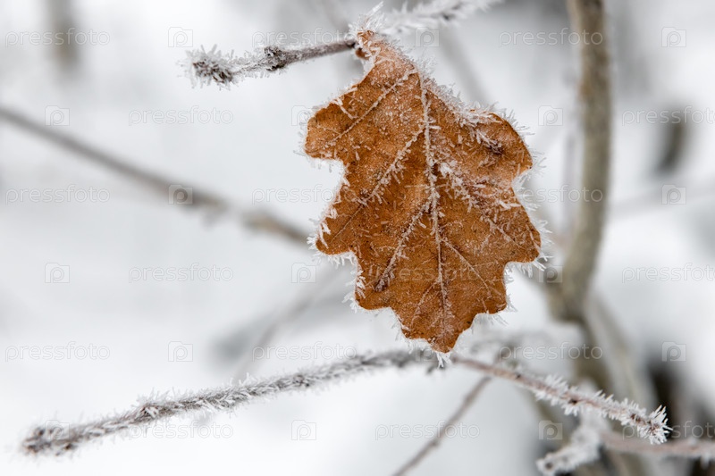 Сухой дубовый лист покрыт морозом в морозный день