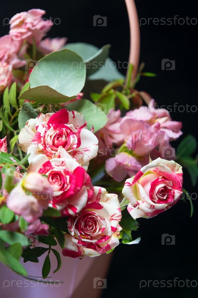 Корзина с розами и цветами на черном фоне