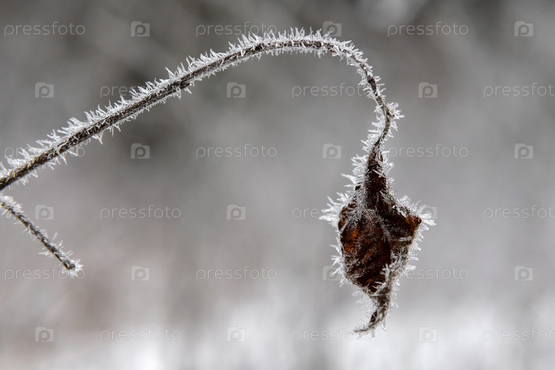 Сухой лист дерева покрыт морозом в морозный день