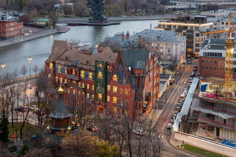 МОСКВА, РЕССИЯ - 28 ноября 2024 года: вид сверху многоквартирного дома Перцова (1907 год).Нео-русское здание на углу Соймоновского прохода и Пречистенской набережной осенним вечером