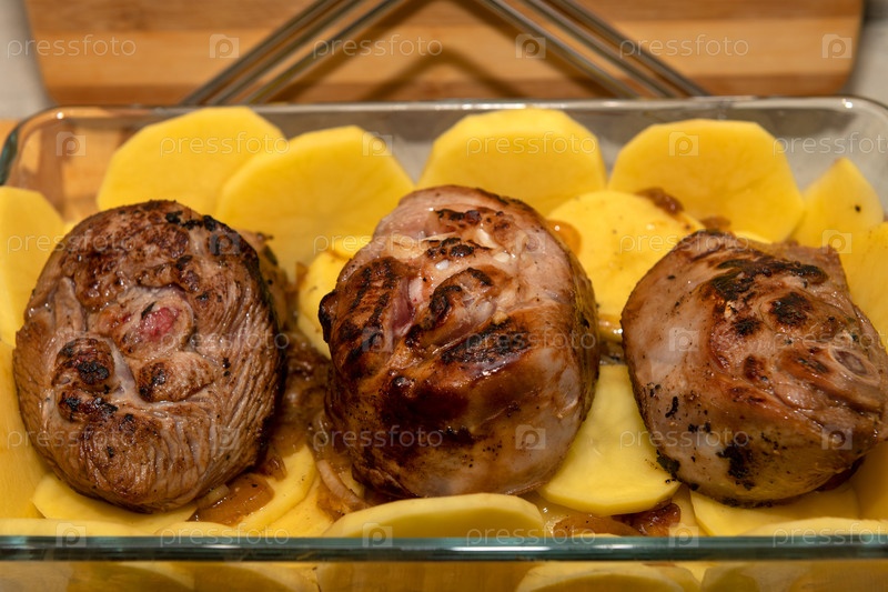 Кусочки жареной индейки помещают на сырые картофели перед выпечкой в духовке