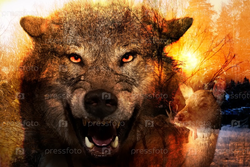 Злой голодный волк на охоте