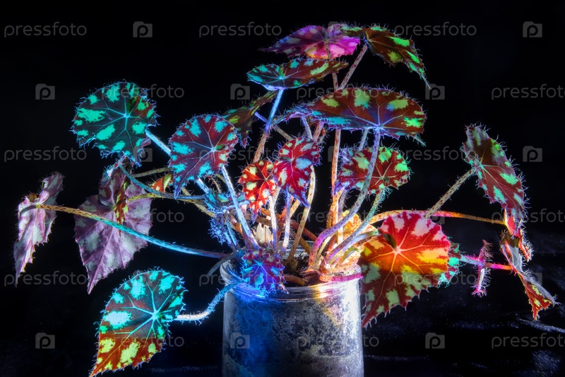 Цветок тигровой бегонии освещается цветным светом