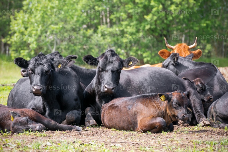 Быки Black Angus пасутся на поле в солнечный летний день