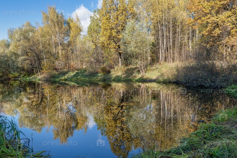 Небольшой пруд в осеннем парке в солнечный день