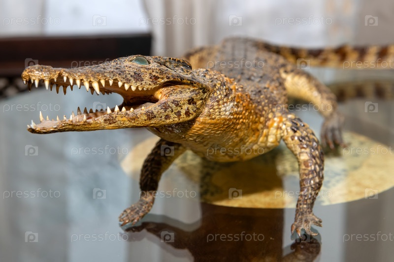 Чучело маленького крокодила с открытой пастью на столе