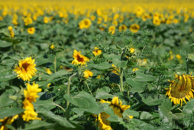 Поле подсолнечных. Летний день в сельской местности. Под ясным, ярким небом есть широкое поле высоких подсолнечников. Цветы имеют толстый стебель и широкий цветок с желтыми лепестками