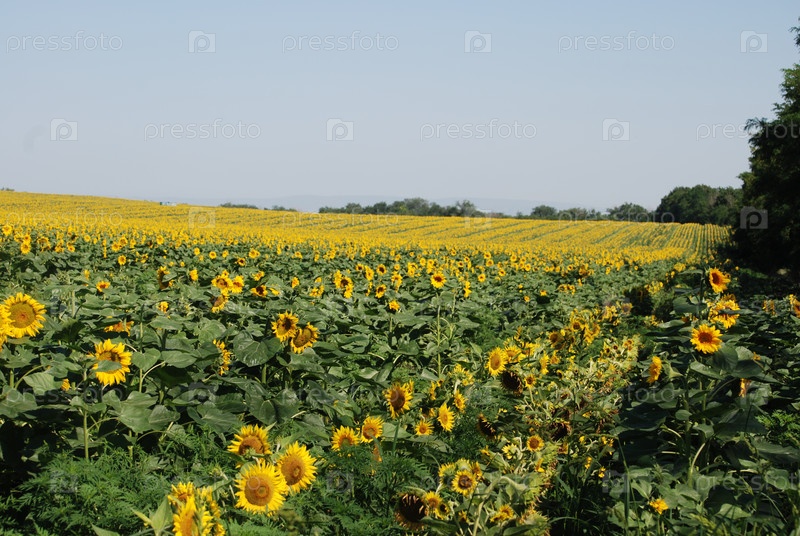 Поле подсолнечных. Летний день в сельской местности. Под ясным, ярким небом есть широкое поле высоких подсолнечников. Цветы имеют толстый стебель и широкий цветок с желтыми лепестками