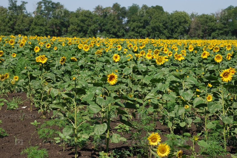 Большие цветы с толстым длинным стеблем, широкие зеленые листья росли в поле. Они имеют широкое соцветие с желтыми лепестками на краях и семенами посередине