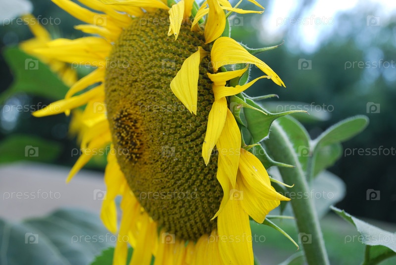 Цветок подсолнечника. Близкий план желтого цветка подсолнечника. Растение имеет толстый длинный стебель с широкими зелеными листьями. Широкое соцветие с желтыми лепестками на краях и семенами посередине