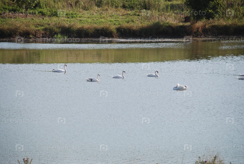 Стадо лебедей плавает в пруду