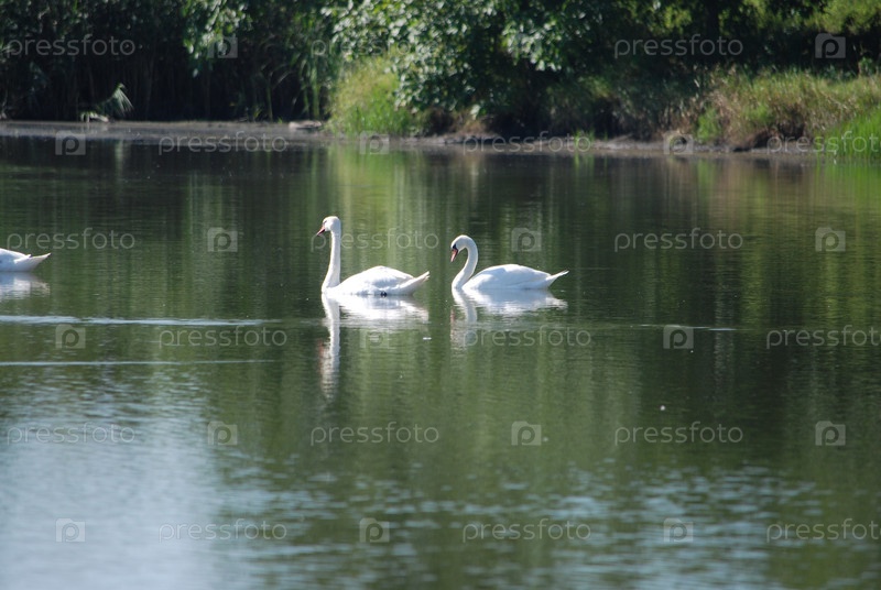 Несколько лебедей плавают в пруду