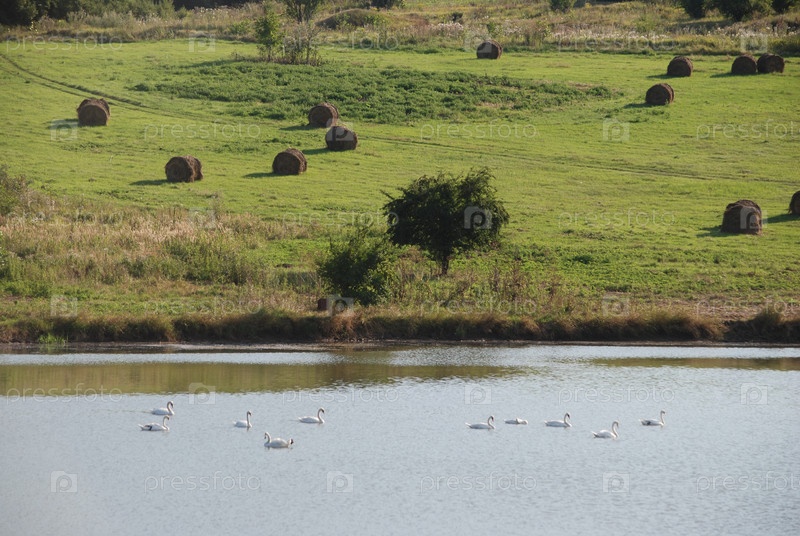 Стадо лебедей плавает в пруду
