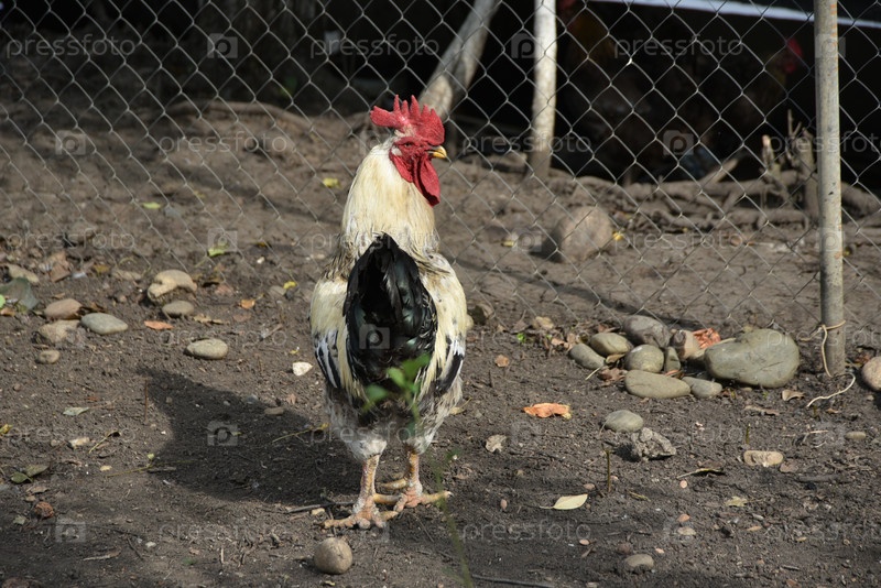 Птица на сельской ферме имеет седые перья, красные глаза и черный клюв. У петуха маленькая голова на подвижной шее и обрезанные крылья. Он ходит вокруг двора