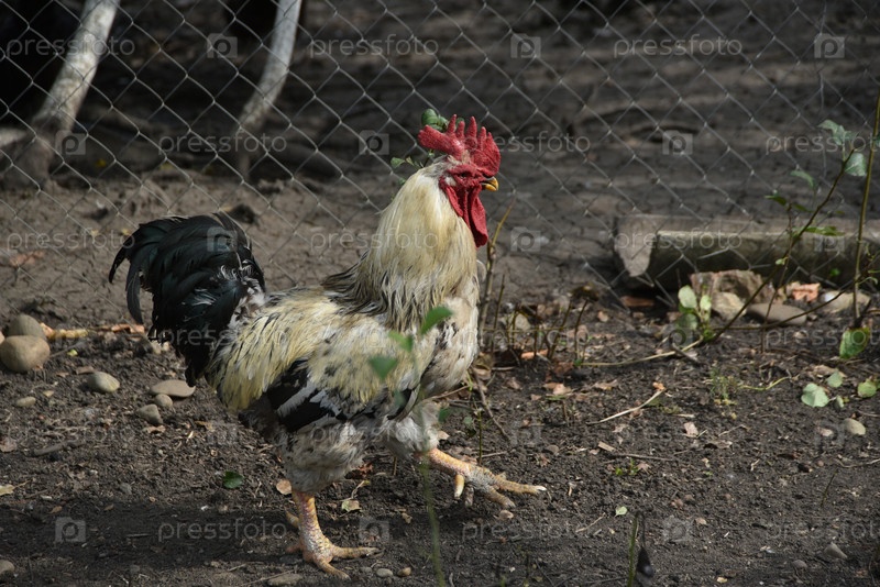 Птица на сельской ферме имеет седые перья, красные глаза и черный клюв. У петуха маленькая голова на подвижной шее и обрезанные крылья. Он ходит вокруг двора