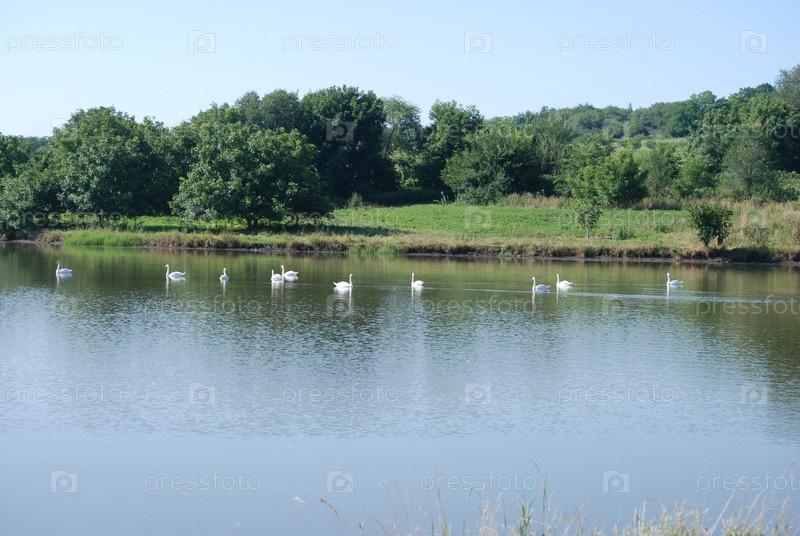 Стадо лебедей плавает в пруду