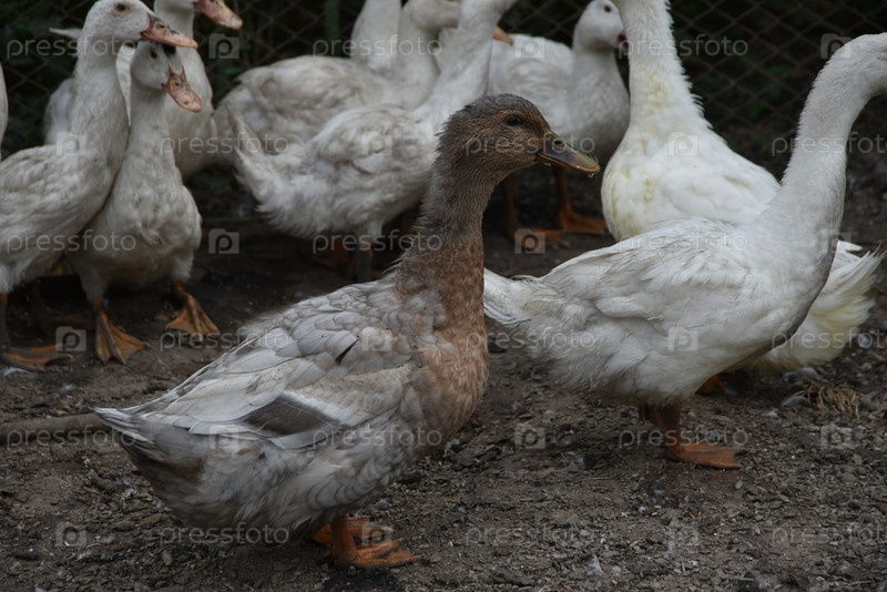 Птицы на ферме. Гуси и утки пасутся на птицефабрике. У них белое или серое оперение, желтые или красные ноги и клювы. Большое стадо птиц пасет во дворе, чесая зерно и пить воду