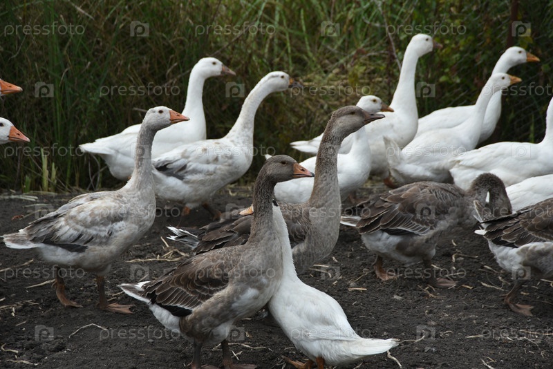 Птицы на ферме. Гуси и утки пасутся на птицефабрике. У них белое или серое оперение, желтые или красные ноги и клювы. Большое стадо птиц пасет во дворе, чесая зерно и пить воду