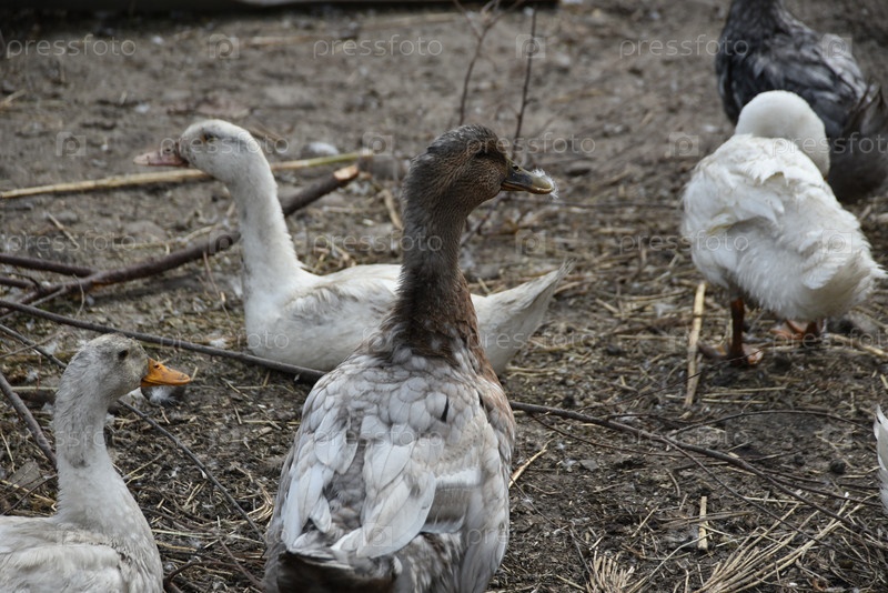 Птицы на ферме. Гуси и утки пасутся на птицефабрике. У них белое или серое оперение, желтые или красные ноги и клювы. Большое стадо птиц пасет во дворе, чесая зерно и пить воду