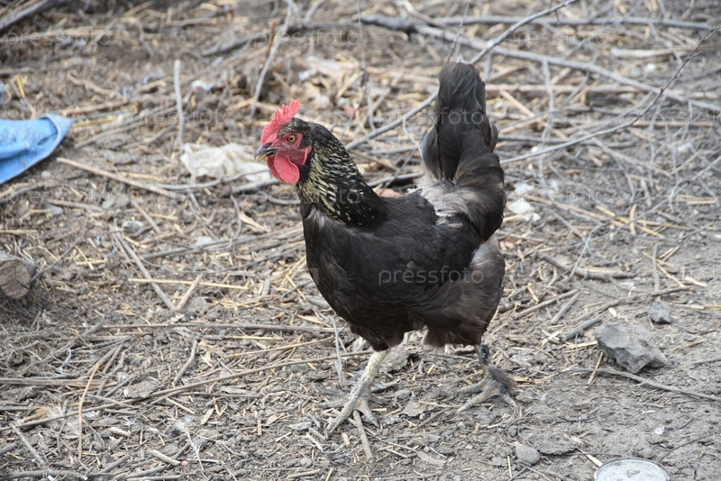 Птица на сельской ферме имеет черное оперение, красные глаза и черный клюв. У петуха маленькая голова на подвижной шее и обрезанные крылья. Он ходит вокруг двора