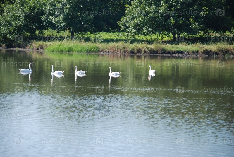 Стадо лебедей плавает в пруду