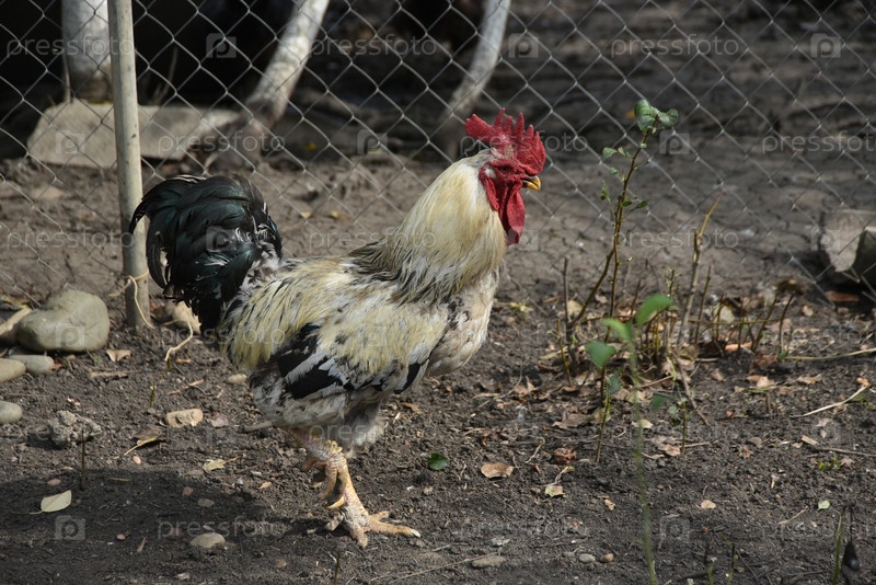 Птица на сельской ферме имеет седые перья, красные глаза и черный клюв. У петуха маленькая голова на подвижной шее и обрезанные крылья. Он ходит вокруг двора
