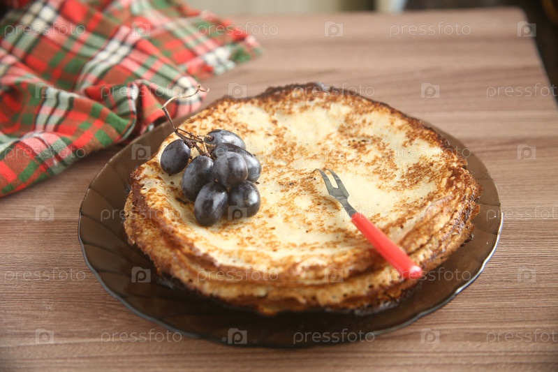 Румяные блины с синим виноградом на столе. Праздник масленица