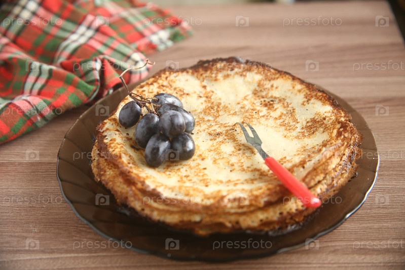 Румяные блины с синим виноградом в руке. Праздник масленица