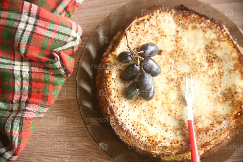 Румяные блины с синим виноградом на тарелке. Праздник масленица