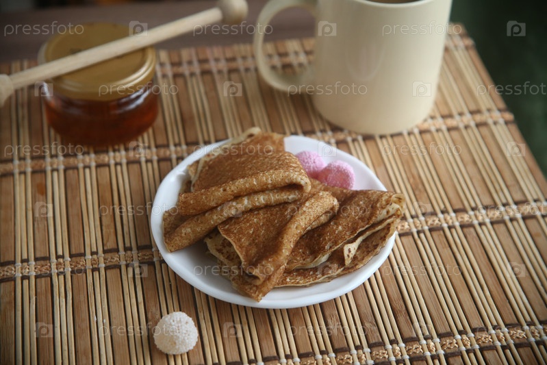 Румяные блины с медом на столе. Праздник масленица