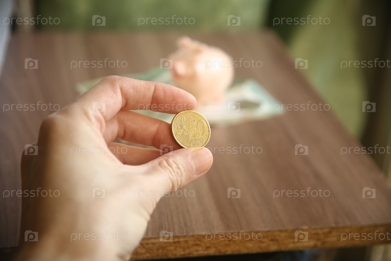 Рука держит монету евро над столом. Покупка валюты. Концепция экономии и бюджета