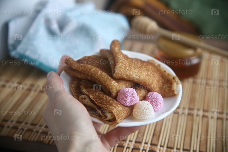 Румяные блины с медом в руке. Праздник масленица