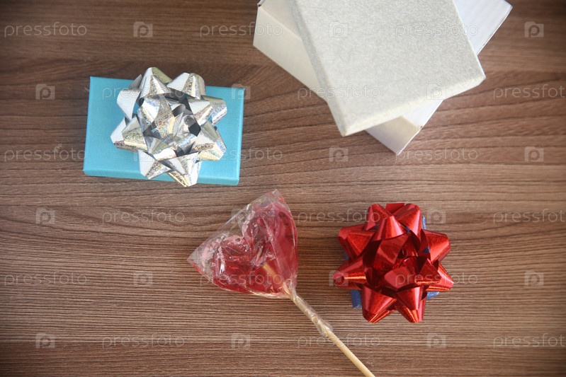 Подарочные коробочки с бантами и леденец на столе. Международный женский день
