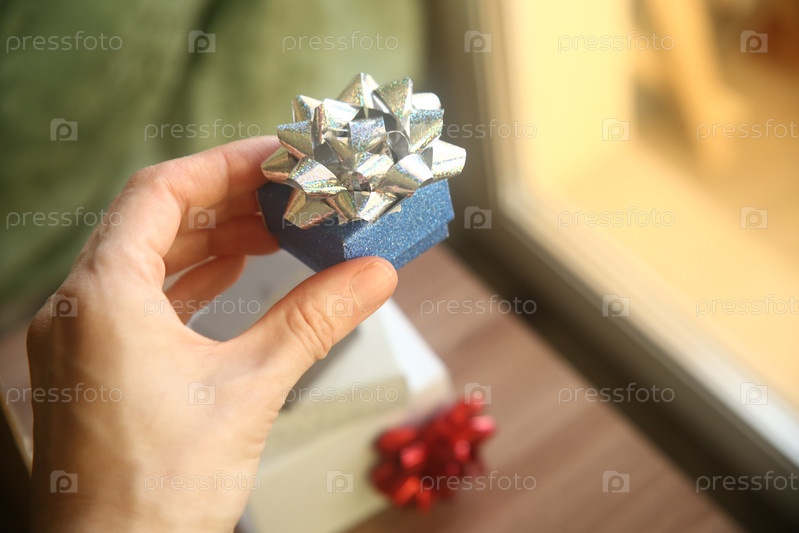 Женская рука держит подарочную голубую коробку в руке. Международный женский день