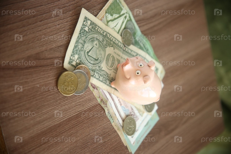 Фигурка свинки стоит на денежных банкнотах купюрах долларах, рядом лежат с монеты евро. Накопления и денежные вложения. Покупка валюты. Концепция экономии и бюджета
