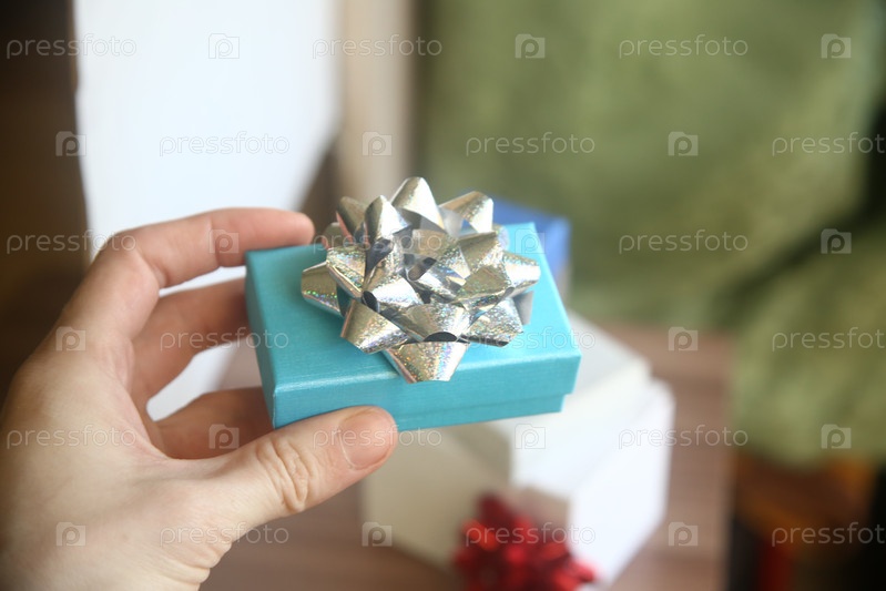 Женская рука держит подарочную голубую коробку в руке. Международный женский день