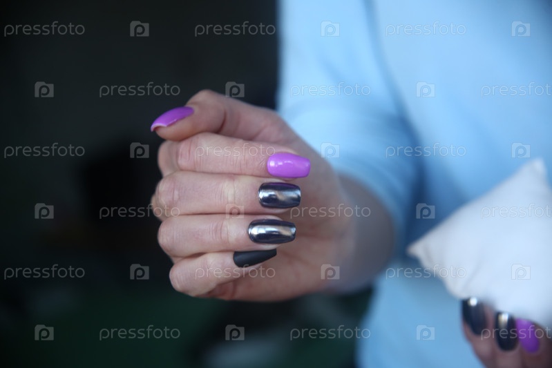 Женская рука с красивым разноцветным маникюром на ногтях. Тема красоты и ухода за руками. крупный план