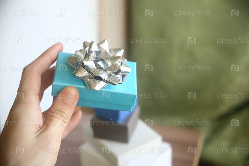 Женская рука держит подарочную голубую коробку в руке. Международный женский день