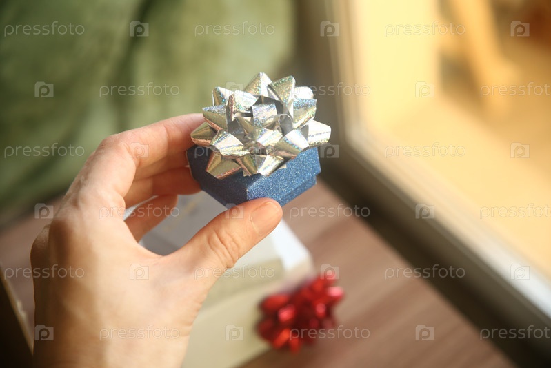 Женская рука держит в руке коробку с подарками.Международный женский день. woman's day