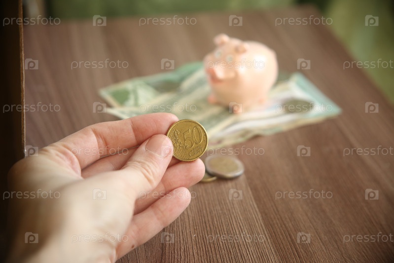 Рука держит монету пятьдесят евро на фоне других монет и денег разного эквивалента. Накопления и денежные вложения. Обвал рубля. Концепция экономии и бюджета