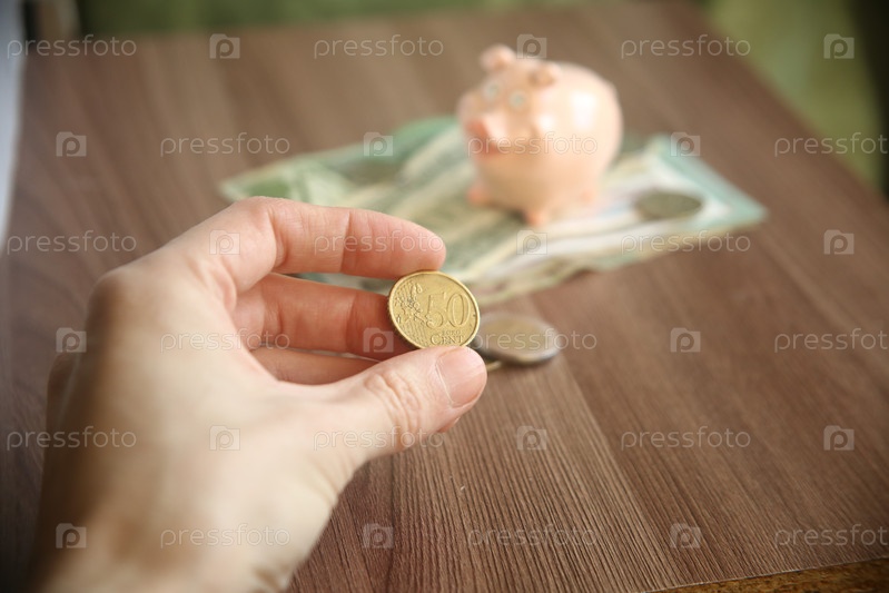 Рука держит монету пятьдесят евро на фоне других монет и денег разного эквивалента. Накопления и денежные вложения. Обвал рубля