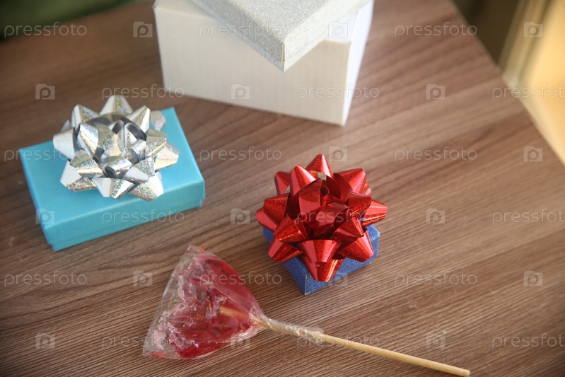 Подарочные коробочки с бантами и леденец на столе. Международный женский день