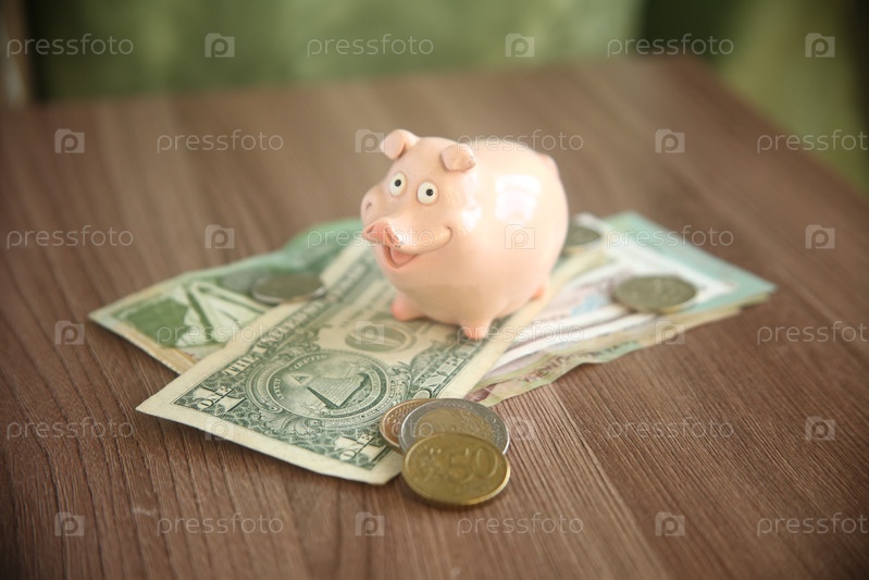 Фигурка свиньи стоит на денежных банкнотах купюрах долларах, рядом лежат с монеты евро. Накопления и денежные вложения. Покупка валюты. Концепция экономии и бюджета