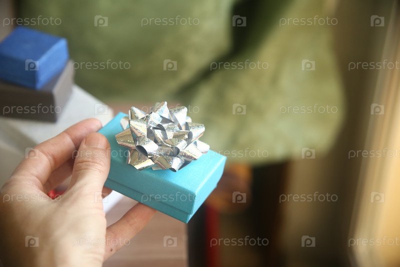 Женская рука держит подарочную голубую коробку в руке. Международный женский день