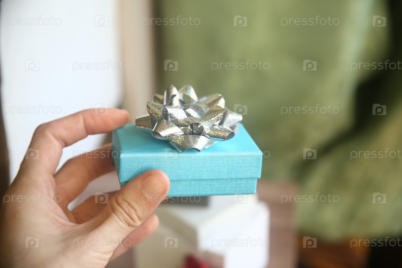 Женская рука держит подарочную голубую коробку в руке. Международный женский день
