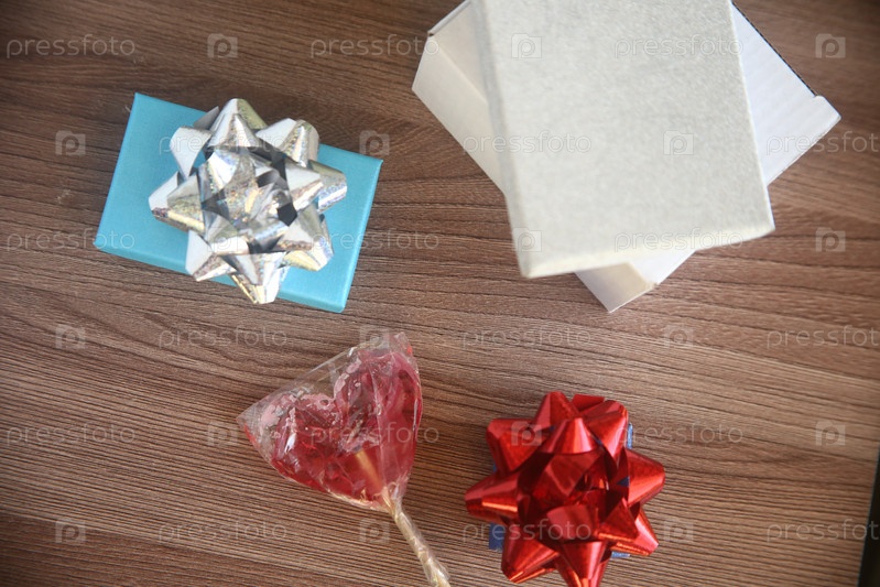 Подарочные коробочки с бантами и леденец на столе. Международный женский день