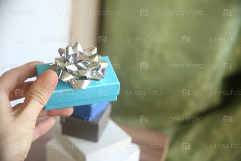 Женская рука держит подарок в руке. Голубая коробочка с бантом. Международный женский день
