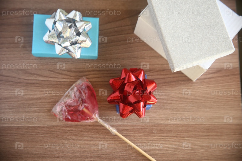 Подарочные коробочки с бантами и леденец на столе. Международный женский день
