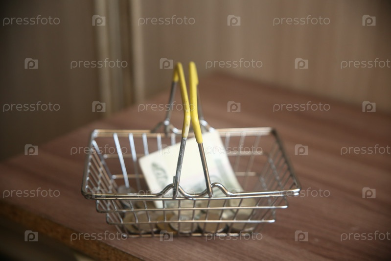 Деньги рубли банкноты и монеты в маленькой металлической корзине для покупок. Финансы и кредит. Покупки и продовольственная сфера. Крупный план