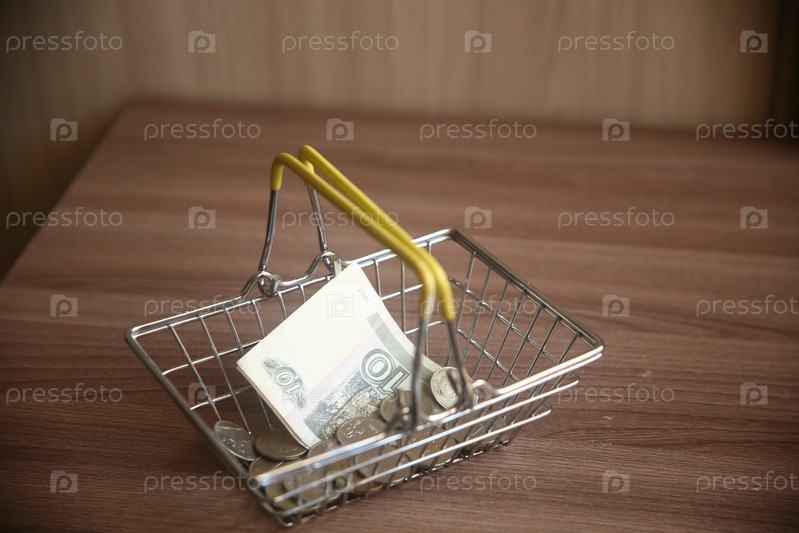 Деньги рубли банкноты и монеты в маленькой металлической корзине для покупок. Финансы и кредит. Покупки и продовольственная сфера. Крупный план